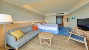 一方、アクアスクエアは全室洋室のスマートな雰囲気。オーシャンビュールーム、コートヤードルーム(山側)、ユニバーサルルームの3タイプがあります。デザインはモダンでスタイリッシュ、シングルやダブルルームも充実しているので、カップルや一人旅の方に人気です。