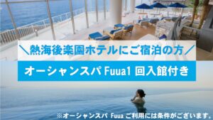 熱海後楽園ホテルといえば、「オーシャンスパFuua(フーア)」が有名ですよね!海に浮かぶようなインフィニティ露天風呂や癒しのリラクゼーションラウンジが人気で、宿泊者は1泊につき1回無料で利用できます。