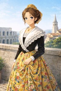 代表格は「アルルの女(アルレジエンヌ)」スタイル。作曲家ビゼーのオペラ「アルルの女」でも知られる、上品で優雅なスタイルです。白いブラウスに黒いボディス、花柄スカート、そして胸元に三角形のレース飾り布「フィシュ(Fichu)」を垂らすのが特徴。いまでもアルルでは「女王(レーヌ・ダルル)」を伝統衣装で選ぶ行事が続いています。
