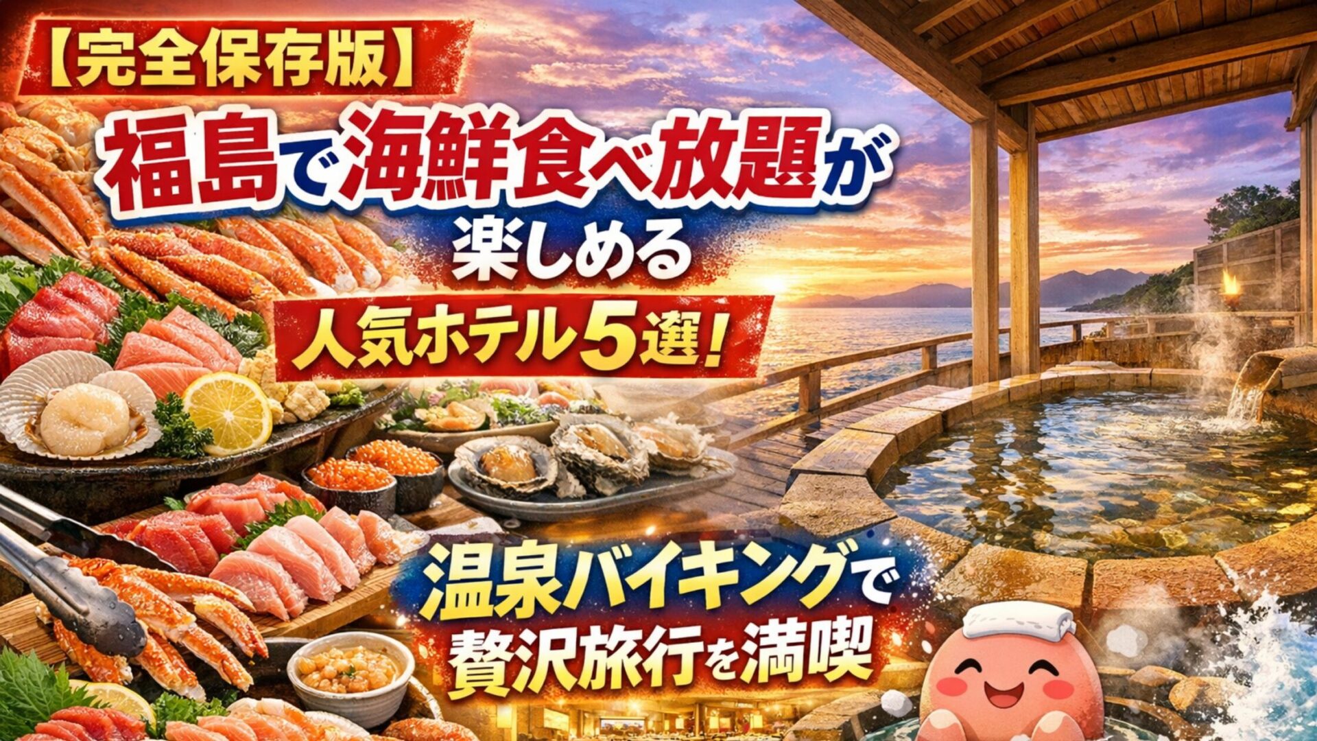 今回は、福島で海鮮食べ放題が楽しめる人気ホテルを厳選して5つご紹介します。しかも、ただ海鮮が食べられるだけじゃなくて、温泉も一緒に楽しめちゃうんです。家族旅行でも、カップルでの旅行でも、きっと満足できる素敵なホテルばかりですよ♪