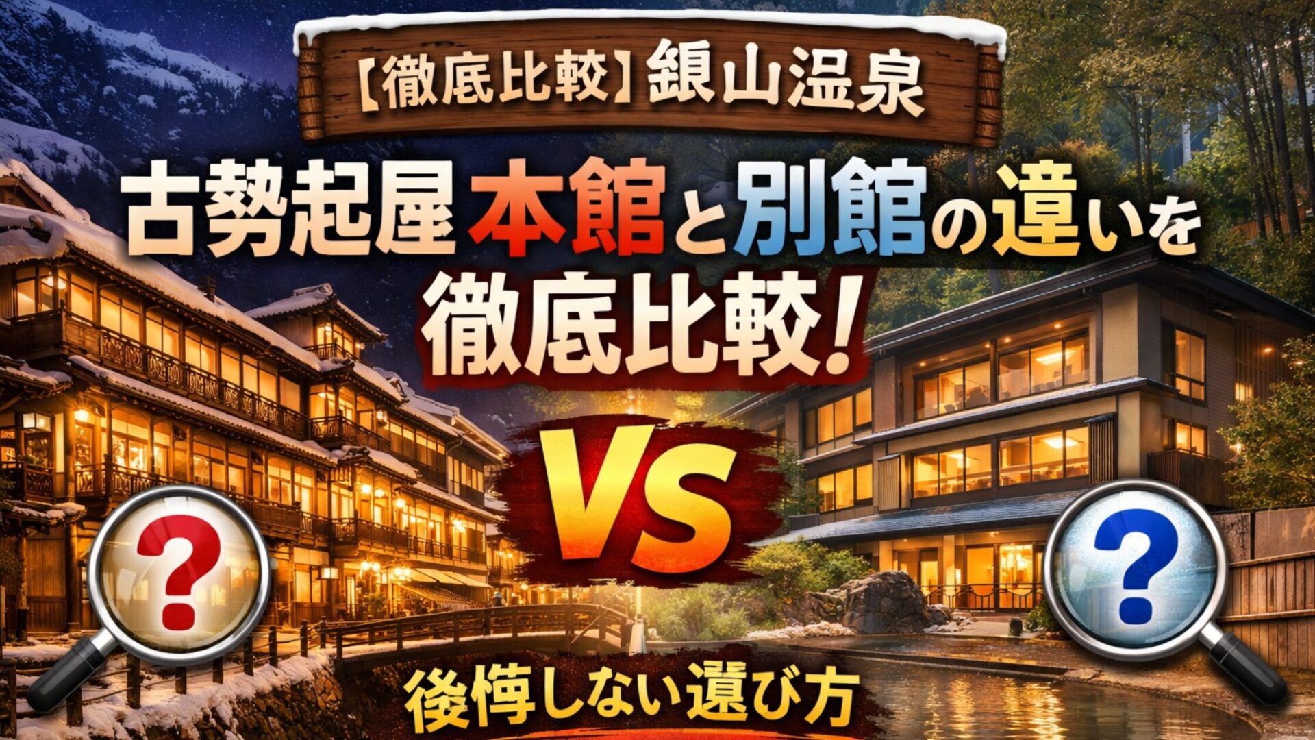 どちらを選んでも、千と千尋の神隠しのような幻想的な銀山温泉の街並みを楽しめますし、姉妹館の温泉も利用できます。大切なのは「何を重視するか」。
