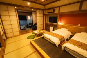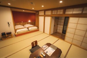 スーペリアは「贅沢な広さ」と案内されるだけあって、写真でも開放感が伝わってきます。ベッド2台+布団2組で、家族でもゆったり過ごせます。床材や家具も新しく、清潔感を重視する方には安心材料になります。