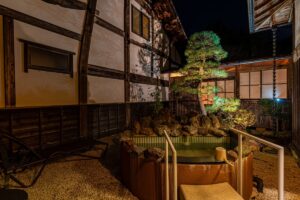 - 特徴:古民家移築、囲炉裏・梁、内風呂+岩の露天風呂