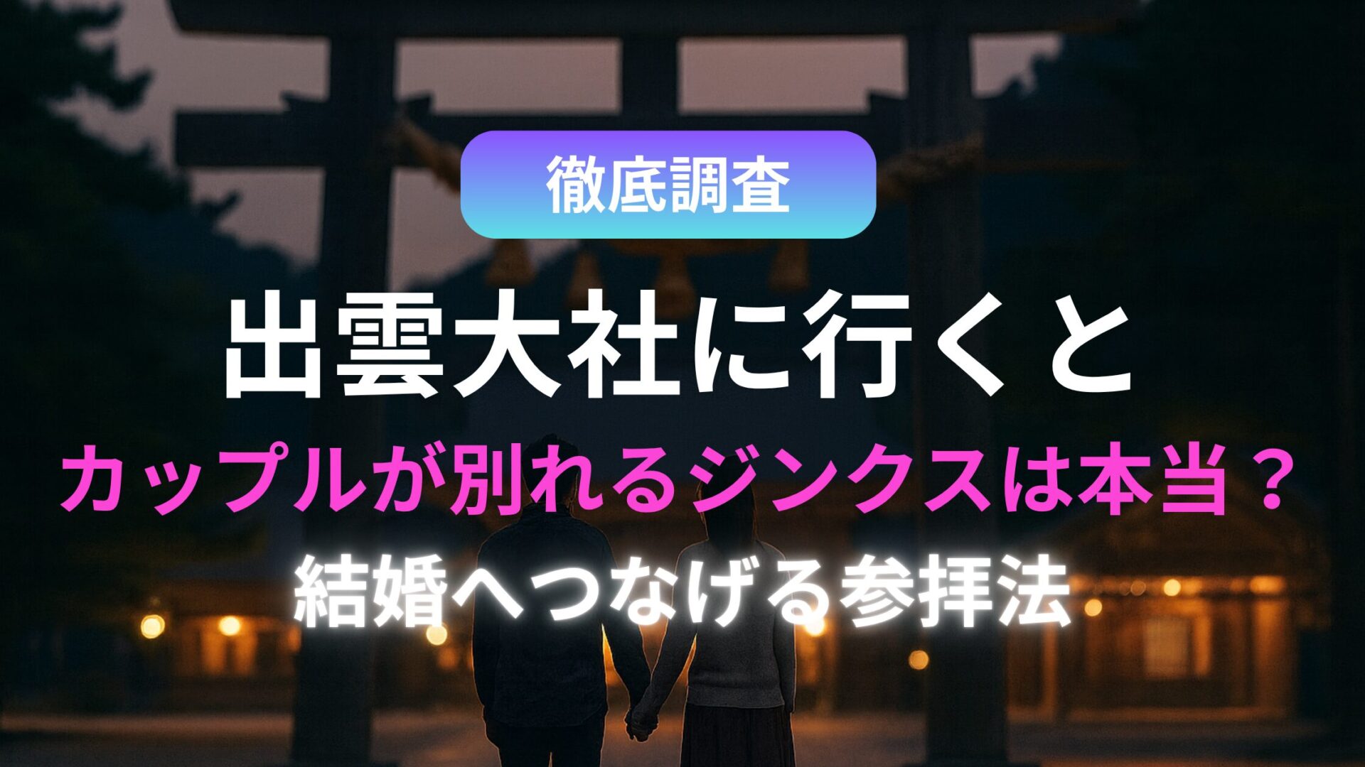 安心してください。この「別れるジンクス」は、実は根拠のない迷信に近いものなんです。この記事では、そのジンクスの正体を徹底解明しつつ、カップルが出雲大社で最高のご利益を受けるためのマナーや過ごし方、さらには結婚に向けた参拝のポイントまでをご紹介します。正しい知識を持って訪れれば、出雲大社はあなたたちの絆を深める素敵な場所になるはずですよ。