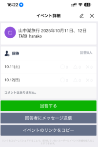 すると、カレンダー形式で表示されて、みんなが「参加できる」「参加できない」「未定」を選べます。一目で誰がいつ空いてるかわかるので、日程調整がスムーズです。