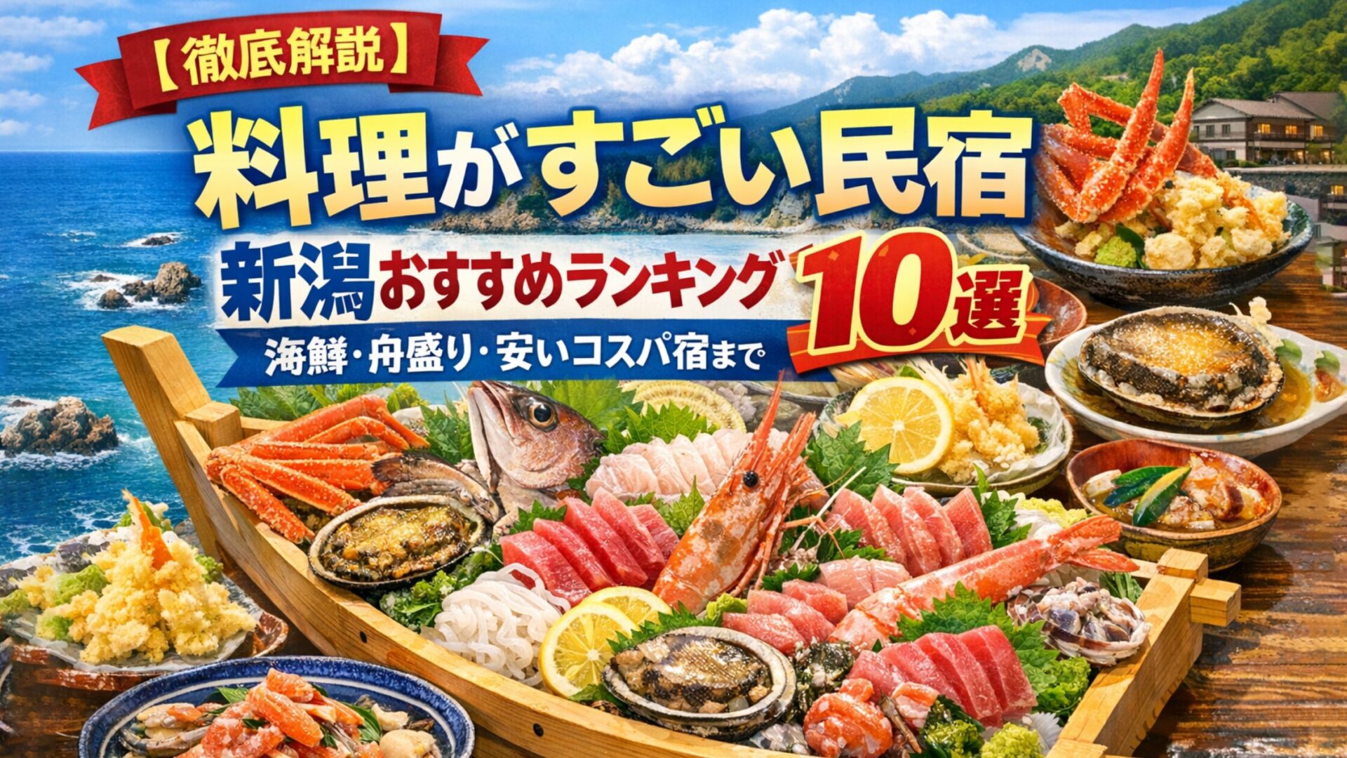 今回は、新潟で料理がすごい民宿ランキング10選として、海鮮・舟盛り・カニが食べきれないほど出てくる宿を厳選してご紹介しました。
