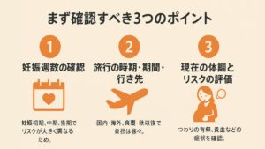 妊娠が分かって旅行をどうするか迷った時は、まず以下のポイントを整理してみましょう。