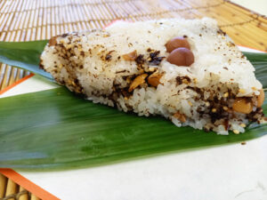 毎朝もち米を蒸し上げる手作りの逸品。三角形の見た目もかわいい、おにぎり感覚のおこわです。新大阪駅でお土産分をまとめ買いして、新幹線の中で食べるのも楽しみのひとつ。あるようでない具材の組み合わせが人気の秘密です。