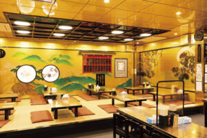店内に入ると驚くのが、その豪華絢爛な内装!壁一面の金箔、贅を尽くした輪島塗、ダイヤモンドの目を持つお狐様、そして金箔のトイレまで。まさに竜宮城のようなゴージャスさで、殿様気分を味わえます。