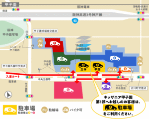 道を間違えてもUターンできないので、ナビを設定して最短距離で向かいましょう。甲子園駅前には大きな警察署があり、一方通行違反で捕まっている車もよく見かけます…。気をつけてくださいね。