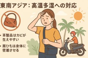 東南アジアでは、高温多湿に対応できる素材選びが重要です。革製品はカビが生えやすいので、ナイロンやポリエステルなどの化学繊維がベター。