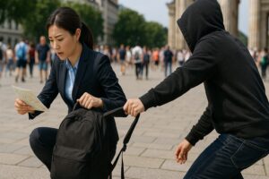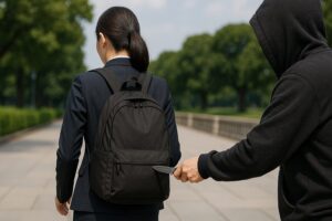 リュックを下ろそうとした瞬間にひったくられたり、下ろした荷物に気を取られている隙に別の貴重品を盗まれたりという被害が実際に報告されています。特に混雑した観光地や駅では要注意です。