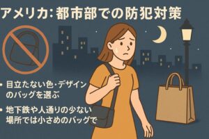 アメリカの大都市では、日本とはレベルの違う犯罪に巻き込まれる可能性もあります。特に夜間の外出時は、目立たない色・デザインのバッグを選ぶことが重要。