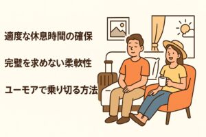 こうした休息時間を意識的に作ることで、お互いに余裕を持って旅行を楽しめます。