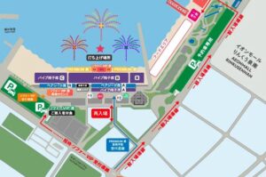 小さなお子様連れや荷物が多い場合は車が便利ですが、花火大会当日は大規模な交通規制が敷かれ、周辺道路は激しく渋滞します。