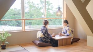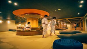 本館2階には畳敷きの「和みスペース」があって、裸足でリラックスできます。窓際には寝転がれるソファクッションも設置されていて、湯上りのひとときをゆっくり楽しめますよ。