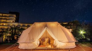 白浜御苑では、ホテルの一部でグランピングも体験可能。自然を感じながらラグジュアリーなテント泊が楽しめて、アウトドア好きや新しい体験を求める人におすすめです。